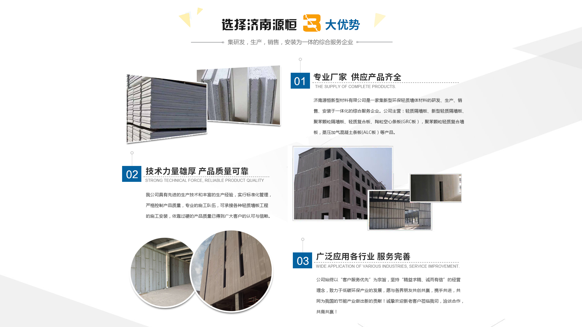 濟(jì)南源恒新型材料有限公司坐落于美麗的泉城濟(jì)南,是集新型環(huán)保輕質(zhì)墻體材料的研發(fā)、生產(chǎn)、銷(xiāo)售、安裝于一體化的綜合服務(wù)企業(yè)。我公司具有的生產(chǎn)技術(shù)和豐富的生產(chǎn)經(jīng)驗(yàn),為您提供輕質(zhì)隔墻板、新型輕質(zhì)隔墻板、聚苯顆粒隔墻板、輕質(zhì)復(fù)合板、陶粒空心條板(GRC板),聚苯顆粒輕質(zhì)復(fù)合墻板,蒸壓加氣混凝土條板(ALC板)等產(chǎn)品,本公司有專(zhuān)的施工隊(duì)伍,可承接各種輕質(zhì)墻板工程的施工安裝。輕質(zhì)隔墻板是國(guó)家推廣使用的新型輕質(zhì)、綠色無(wú)害建材,是墻改節(jié)能政策大力扶持的環(huán)保節(jié)能產(chǎn)品,是發(fā)達(dá)國(guó)家普遍采用的新型墻體材料。濟(jì)南源恒新型材料有限公司實(shí)行標(biāo)準(zhǔn)化管理,嚴(yán)格控制產(chǎn)品質(zhì)量,依靠過(guò)硬的產(chǎn)品質(zhì)量已得到廣大客戶(hù)的認(rèn)可與信賴(lài)。公司產(chǎn)品遍布各大城市,與國(guó)內(nèi)多家客戶(hù)建立了良好的合作關(guān)系。公司始終以“客戶(hù)服務(wù)優(yōu)先”為宗旨,堅(jiān)持“精益求精、誠(chéng)而有信”的經(jīng)營(yíng)理念,致力于低碳環(huán)保產(chǎn)業(yè)的發(fā)展,愿與各界朋友共創(chuàng)共贏,攜手共進(jìn),共同為我國(guó)的節(jié)能產(chǎn)業(yè)做出新的...